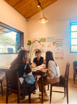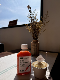 When I got into the cafe, I felt warm and lovely. The decoration of the cafe is simple, using natural material to build up. Some wall paintings were created by local people. The most beautiful thing is that six young teenagers tried to figure out a way to use their knowledge and skills to give back to their birthplace, Jeju. The goal is to maintain sustainable development in Jeju by commoning with friends and land. These teens learned organic farming skills from retired farmers, and now they farm by themselves. This is not only a process of learning but also the inheritance of traditional farming culture that can be passed down to the next generation.